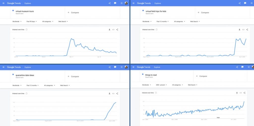 Is interest growing in other terms like virtual field trips for kids, quarantine date ideas, and things to read? Not really. That doesn’t mean there’s not some interest there, but I wouldn’t bet the viability of my organisation on those particular terms.
