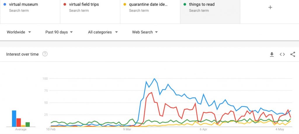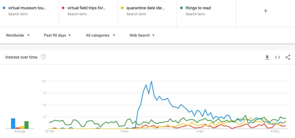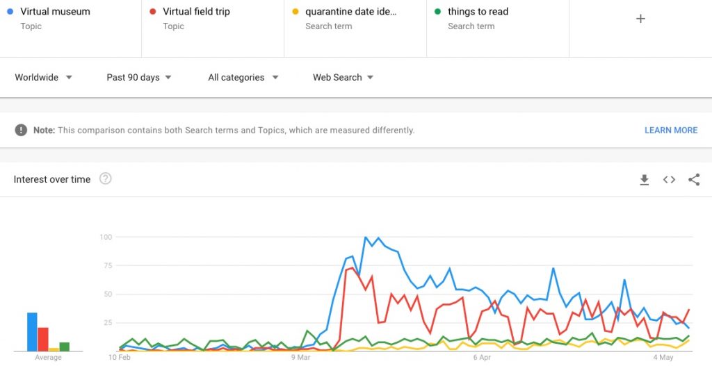 There we go. We can see that ‘virtual museum’ and ‘virtual field trip’ both surged in popularity and have both declined, while still being relatively much more popular than they were before mid-March.