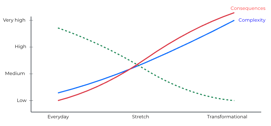 So this is my go at a simple framework. It might also be a way to help distinguish between projects that can and should be delivered smoothly and routinely, and those that ask more of an organisation and carry far greater implications if they go wrong.